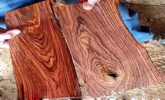 交趾黄檀心材新切面紫红褐或暗红褐,常带黑褐或栗褐色深条纹,有酸香气或微弱,结构细,纹理通常直,气干密度1.01~1.09g/cm³;微凹黄檀心边材区别明显,边材浅黄白色,心材橘红色,久露大气中转为紫红褐色,常带褐色条纹,木射线放大镜下明显,波痕不明显,木材新切面具辛辣气味。